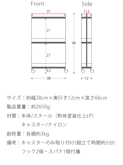 サイズ:約幅38cm×奥行き12cm×高さ66cm 製品重量:約2650g 材質:本体/スチール(粉体塗装仕上げ)、キャスター/ナイロン 耐荷重:各棚約3kg 備考:キャスターのみ取り付け(組立て時間約5分)、フック2個・スパナ1個付属 カテゴリー:キッチン収納/省スペース/スリム/収納ラック//調味料入れ/ランドリー収納/トイレ/便利/白色/黒色/ホワイト/ブラックトップ > キッチン収納 > TOWER(タワー) スリムキッチンワゴン サイズ: 約幅38cm×奥行き12cm×高さ66cm 製品重量: 約2650g 材質: 本体/スチール(粉体塗装仕上げ)、キャスター/ナイロン 耐荷重: 各棚約3kg 備考: キャスターのみ取り付け(組立て時間約5分)、フック2個・スパナ1個付属